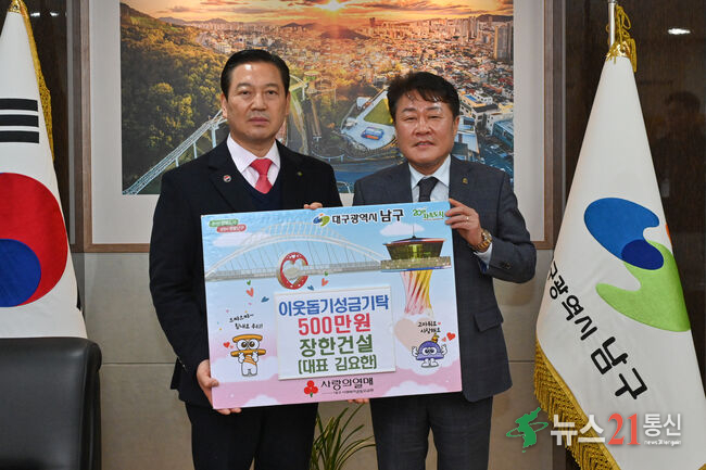 (뉴스21통신) 권혜선기자 = 대구 남구는 장한건설(대표: 김요한)에서 지난 21일, 이웃돕기 성금 500만원을 기탁했다고 밝혔다.