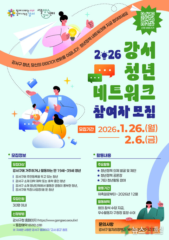 서울 강서구(구청장 진교훈)는 청년들의 능동적인 사회참여 기회를 확대하기 위해 ‘2026 강서 청년네트워크’ 참여자 30명을 모집한다고 밝혔다.