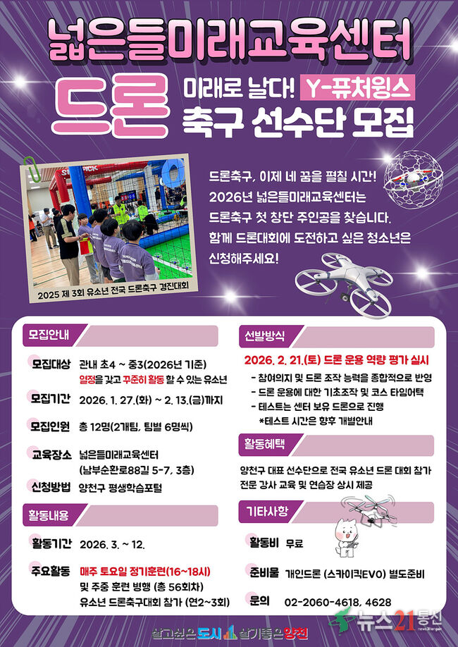 이기재 양천구청장은 “드론축구는 미래 기술과 스포츠가 결합된 융합형 기술 교육 분야로, 청소년들이 흥미와 진로를 함께 확장할 좋은 기회가 될 것”이라며 “넓은들미래교육센터를 거점으로 체계적인 선수 양성 시스템을 구축해 양천구를 대표하는 미래형 스포츠 교육 모델로 발전시켜 나가겠다”고 말했다.