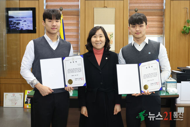 울산 동구의회(의장 박경옥)는 27일 의장실에서 위급한 상황에서 침착한 응급처치로 시민의 생명을 구한 화암고등학교 문현서 학생과 대송고등학교 윤재준 학생에게 표창장을 수여했다.