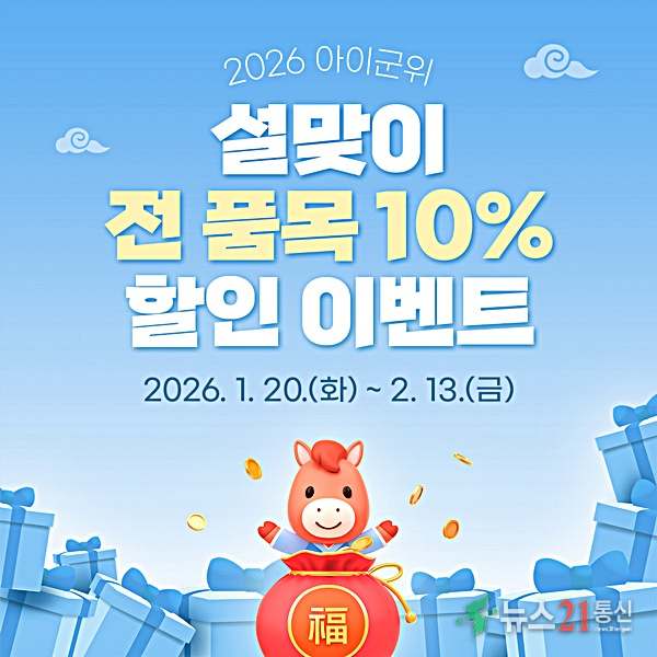 이번 설맞이 전 품목 10% 할인 행사는 1월 20일부터 2월 13일까지 진행되며, 자세한 내용은 아이군위 쇼핑몰(https://igunwi.gunwi.go.kr/)에서 확인할 수 있다.