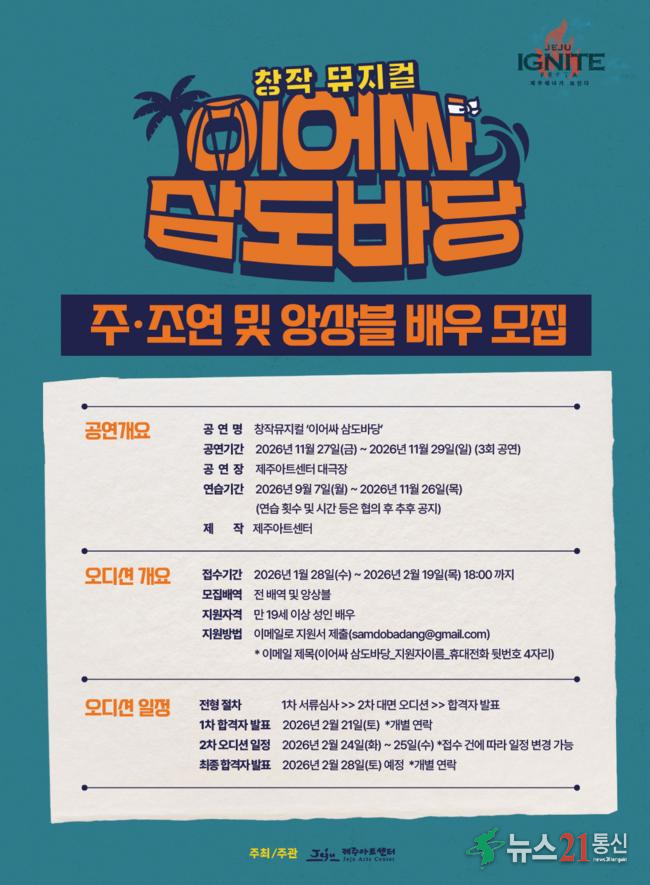제주아트센터는 올해 11월 개최 예정인 창작뮤지컬 ‘이어싸 삼도바당’에 참여할 배우를 모집하고, 공연 오디션을 진행한다.
