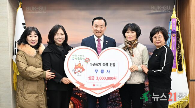 무룡사는 29일 북구청장실에서 이웃돕기 성금 300만원을 박천동 구청장에게 전달했다.