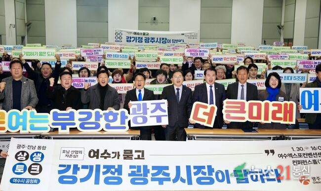 광주전남 통합 도민 상생토크-여수시 [뉴스21통신/장병기 기자] 광주광역시는 30일 여수 엑스포컨벤션센터 컨퍼런스홀에서 ‘광주전남 통합 여수시민과의 상생토크’를 개최, 전남도민과 소통을 이어갔다.
