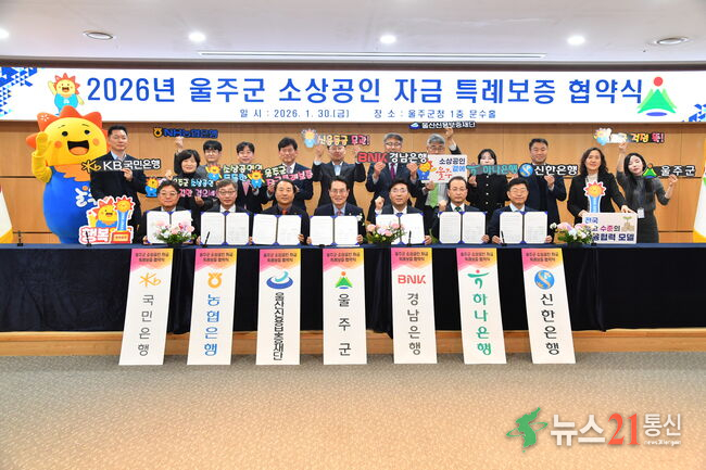 울주군은 이날 군청 문수홀에서 울산신용보증재단과 경남은행, 농협은행, 하나은행, 국민은행, 신한은행 등 5개 금융기관이 참여한 가운데 ‘2026년 소상공인 자금특례보증 지원 업무협약’을 체결했다.