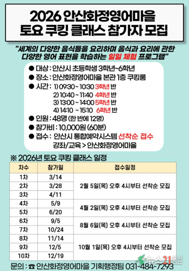 민진영 안산화정영어마을 원장은 “토요 쿠킹 클래스는 높은 만족도와 수요를 기록해 온 영어마을의 대표 프로그램 중 하나”라며 “관심 있는 학생들의 많은 참여를 바란다”고 당부했다.