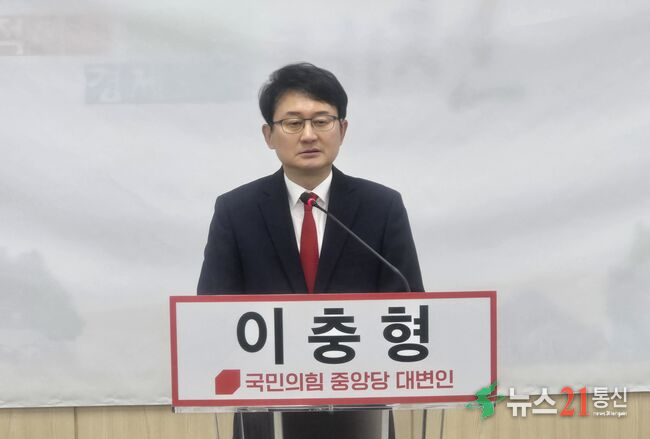 이충형 국민의힘 중앙당 대변인이 제천시청 브리핑실에서 기자회견을 하고 있다.이충형 국민의힘 중앙당 대변인이 제천·충주·원주를 연계하는 ‘중부내륙 골든트라이앵글 특별자치단체’ 구상을 전면에 내세우며, 정부의 광역 대도시 중심 균형발전 정책에 대한 정치적 문제 제기를 공식화했다.