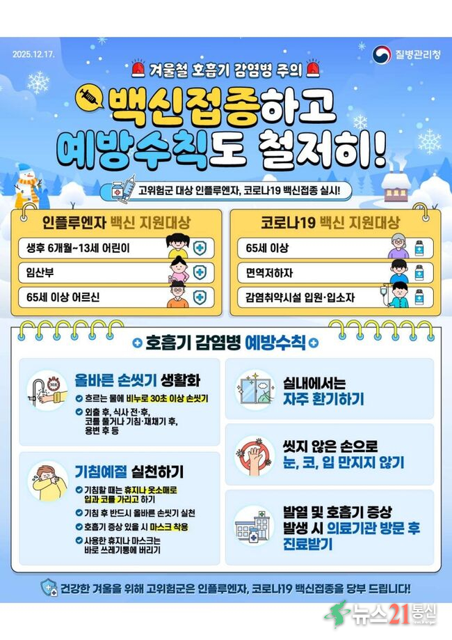 아울러 인플루엔자 예방을 위해서 예방접종과 함께 개인위생 관리가 중요하므로 △외출 후, 식사 전·후 흐르는 물에 비누로 손씻기 △기침 시 입과 코 가리기 △발열·기침 등 호흡기 증상이 있는 경우 마스크 착용 및 외출 자제 △주기적인 실내 환기 △증상 발생 시 신속한 의료기관 방문 등 일상생활 속 호흡기 감염병 예방수칙을 철저히 준수해 줄 것을 당부했다.