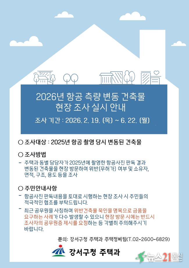 서울 강서구(구청장 진교훈)는 허가받지 않고 신축·증축·개축 등 변동된 건축물을 대상으로 6월 22일까지 현장 조사를 실시한다고 밝혔다. 이번 조사는 서울시 공간정보과에서 제공한 항공사진 판독 결과를 바탕으로 지난해 대비 변동이 확인된 건축물을 대상으로 하며, 화재·붕괴 등 안전사고를 사전에 방지하고 쾌적한 도시...