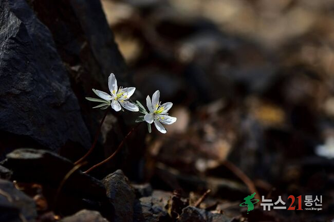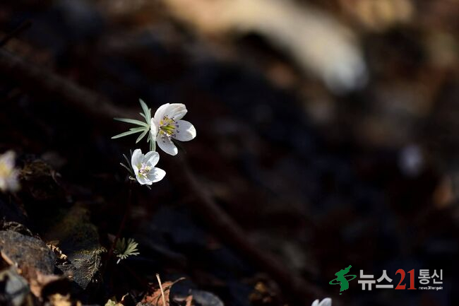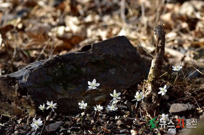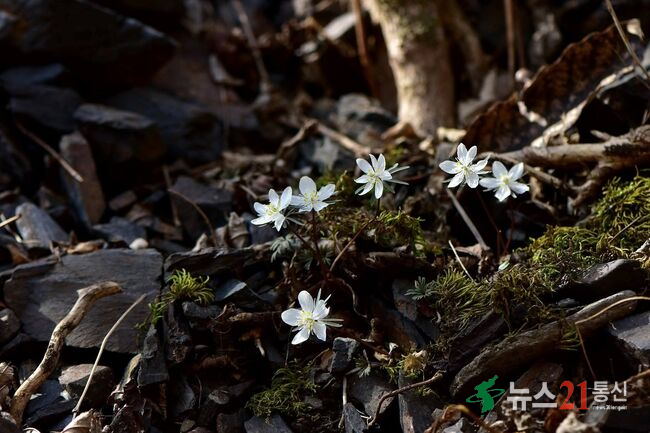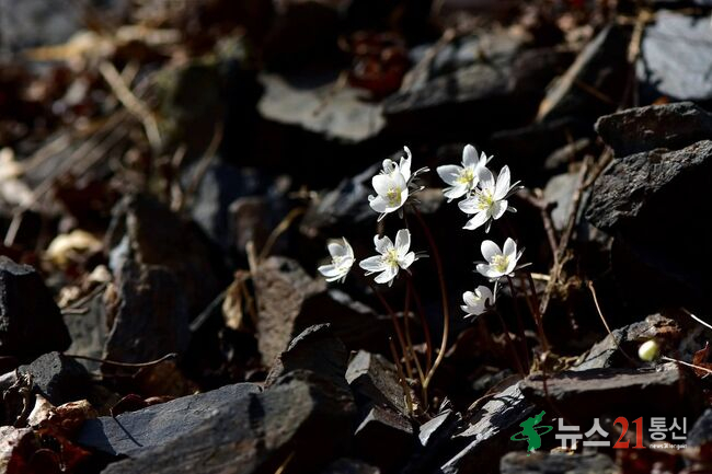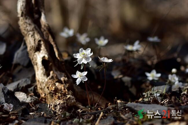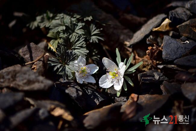 변산바람꽃은 이른 봄에 하얀 꽃을 피우는 한국 특산식물이다.