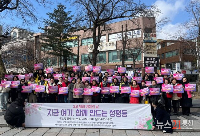 태백가정폭력‧성폭력 통합상담소(소장 이경숙)는 지난 6일 황지연못 일원에서 ‘지금, 여기, 함께 만드는 성평등’을 슬로건으로 ‘3·8 세계 여성의 날 기념식’을 성황리에 개최했다고 밝혔다.이번 행사는 세계 여성의 날을 기념해 지역사회 내 성평등 문화를 확산하고 여성의 권익 증진에 대한 시민들의 관심을 높이기 ..