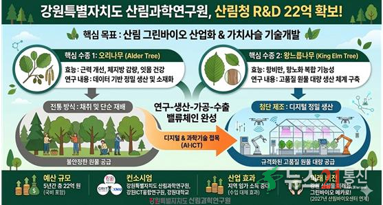 □ 강원특별자치도 산림과학연구원(원장 채병문)은 산림청이 주관하는 ‘산림분야 그린바이오 미래형 가치사슬 기술개발’ 공모사업에 최종 선정돼 5년간 총 22억 원의 국비를 확보했다고 밝혔다.□ 이번 연구과제는 강원 자생 수종인 오리나무와 왕느릅나무를 첨단 ICT 기술과 융합해 고부가가치 소재로 육성하는 ‘디지털 기반 ..