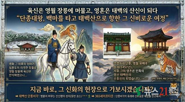 태백시(시장 이상호)는 365세이프타운에서 단종 설화를 활용한 특별 이벤트 ‘영월의 왕, 태백의 수호신이 되다’를 추진하며 영월 관광객을 태백으로 잇는 연계 관광 마케팅에 나선다고 밝혔다.이번 이벤트는 단종의 육신은 영월 장릉에 머물고 있지만 영혼은 태백산의 산신이 되었다는 설화를 바탕으로 기획됐다. 최근 영화 <왕과 ...