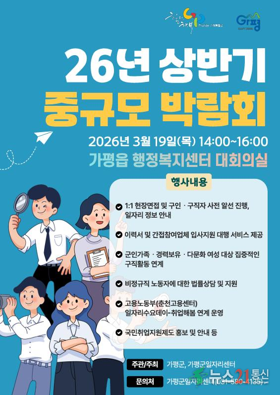 가평군은 19일 오후 2시부터 4시까지 가평읍 행정복지센터 대회의실에서 ‘2026년 상반기 1차 중규모 채용박람회’를 개최한다고 밝혔다.