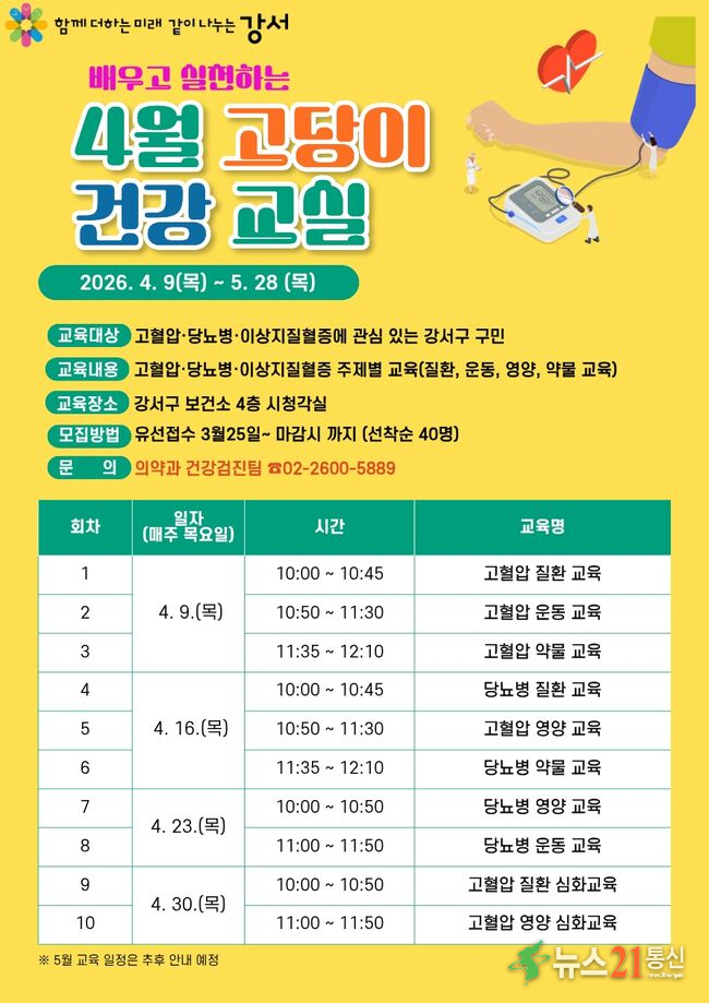 이에 강서구는 고혈압, 당뇨, 이상지질혈증 등 만성질환을 올바르게 이해하고, 생활 속에서 스스로 관리할 수 있도록 무료 건강교실을 마련했다.