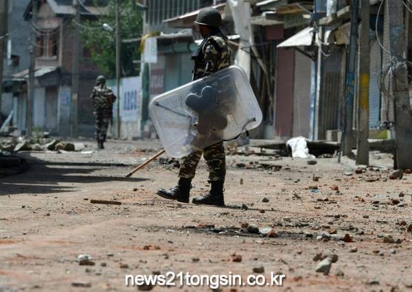 ▲ AFP / Tauseef Mustafa[제공자ⓒ 뉴스21통신. 무단전재-재배포 금지.]인도령 카슈미르 지역에서 16일(현지시간) 군이 시위대에 발포해 사상자가 발생하면서 긴장이 고조되고 있는 있는 가운데 다음날은 17일 인도 군인들이 카슈미르 지역을 감시하고 있다.