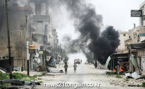 ▲ AFP / Omar haj kadour[제공자ⓒ 뉴스21통신. 무단전재-재배포 금지.]시리아 알레포 타이야밧 알-이맘 마을에서 전투기 공격을 위한 타이어에서 연기가 나자 뛰어가고 있는 시리아 전투원들