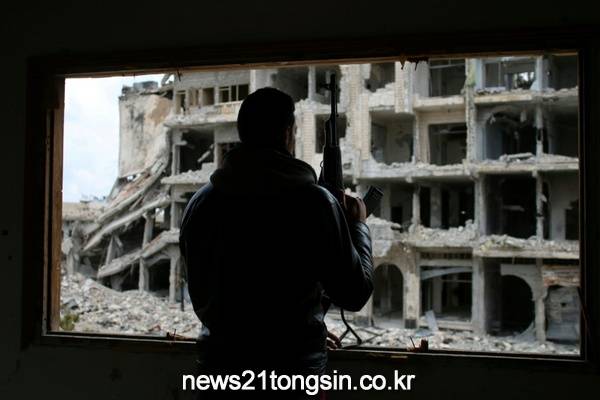 ▲ AFP / Mohamad ABAZEED[제공자ⓒ 뉴스21통신. 무단전재-재배포 금지.]전투로 심하게 손상된 시리아 남부 다라(Daraa)의 한 건물에 반군 대원이 유리 없는 창문을 바라보고 서 있다.