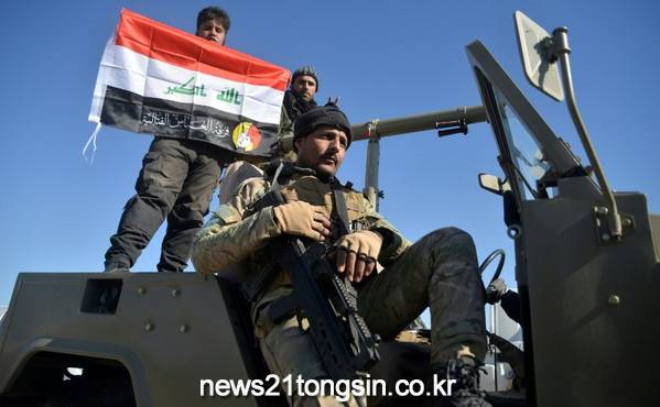 ▲ AFP / STRINGER[제공자ⓒ 뉴스21통신. 무단전재-재배포 금지.]하이데르 알아바디 이라크 총리가 IS를 완전히 격퇴했다고 선언한 후 이라크-시리아 국경에 있는 군인들이 깃발을 펼치며 승리를 기념하고 있다.