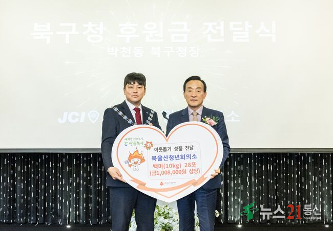 [뉴스21 통신=최병호 ]*사진출처-울산북구청북울산청년회의소는 12일 연암컨벤션에서 열린 창립 35주년 기념식에서 북구 지역 취약계층을 돕기 위한 성품으로 100만8천원 상당의 쌀 28포를 박천동 북구청장에게 전달했다.
