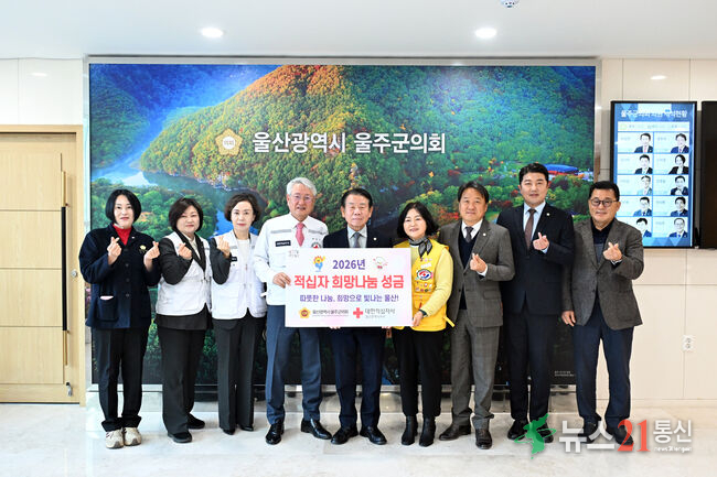 ▲사진제공:울주군청울주군의회(의장 최길영)는 12일 의사당 4층 로비에서 대한적십자사 울산지사에 ‘2026년 적십자 특별회비’를 전달했다. 전달식에는 최길영 의장을 비롯한 군의회 의원들과 대한적십자사 울산지사 채종성 회장, 대한적십자사봉사회 울주군지구 관계자 등이 함께했다. 최길영 의장은 “사회의 가장 낮은 곳을 ..
