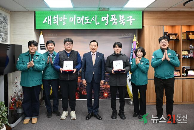 [뉴스21 통신=최병호 ]*사진출처-울산북구청박천동 북구청장이 12일 구청장실에서 하반기 근무성적이 우수한 모범 사회복무요원에게 표창패를 수여한 뒤 기념촬영을 하고 있다.