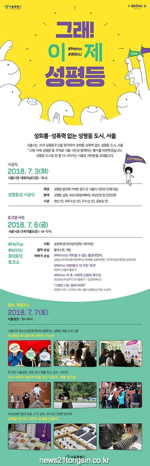 서울시는 성평등주간(7.1~7.7)을 맞아 7일(토) 오전 10시~오후 4시까지 서울광장에서 ‘그래!이제 성평등’을 주제로 2018 성평등주간 기념행사를 개최한다고 밝혔다.