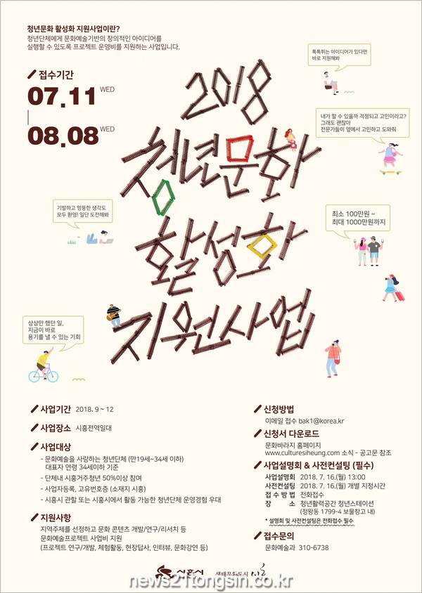 시흥시(시장 임병택)는 지역 청년 세대에게 창의적이고 실험적인 문화예술 활동의 기회를 제공하기 위해 오는 7월 11일부터 8월 8일까지 29일간 <</span>청년문화 활성화 지원 사업>을 공모한다.