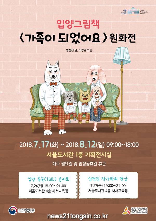 (뉴스21통신/서울서부취재본부)= 서울도서관은 오는 17일(화)부터 8월 12일(일)까지 약 한 달간, 중앙입양원과 공동주최로 입양동화 <</span>가족이 되었어요> 원화 전시와 전시 연계 프로그램 ‘입양 톡톡(talk) 콘서트’, ‘임정진 작가와의 만남’을 운영한다고 밝혔다.