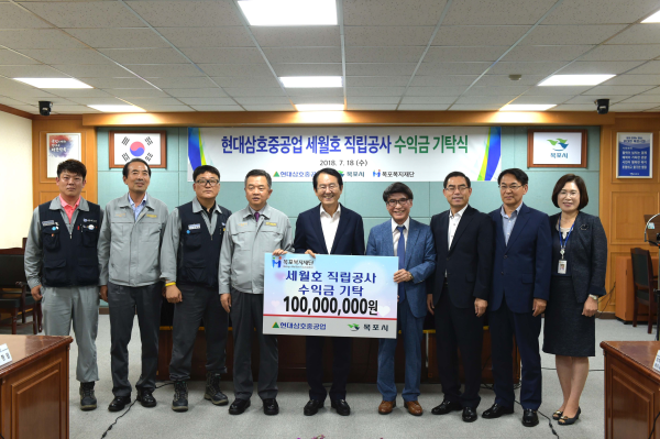 현대삼호중공업이 18일 목포복지재단에 세월호 직립공사 수익금을 기탁했다.