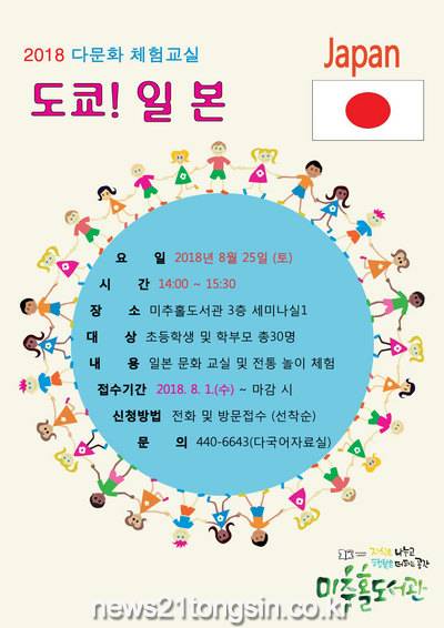 인천시(시장 박남춘) 미추홀도서관은 8월의 다문화체험교실 ‘도쿄!일본’을 오는 8월 25일(토) 오후 2시 세미나실1(3층)에서 진행한다고 밝혔다.