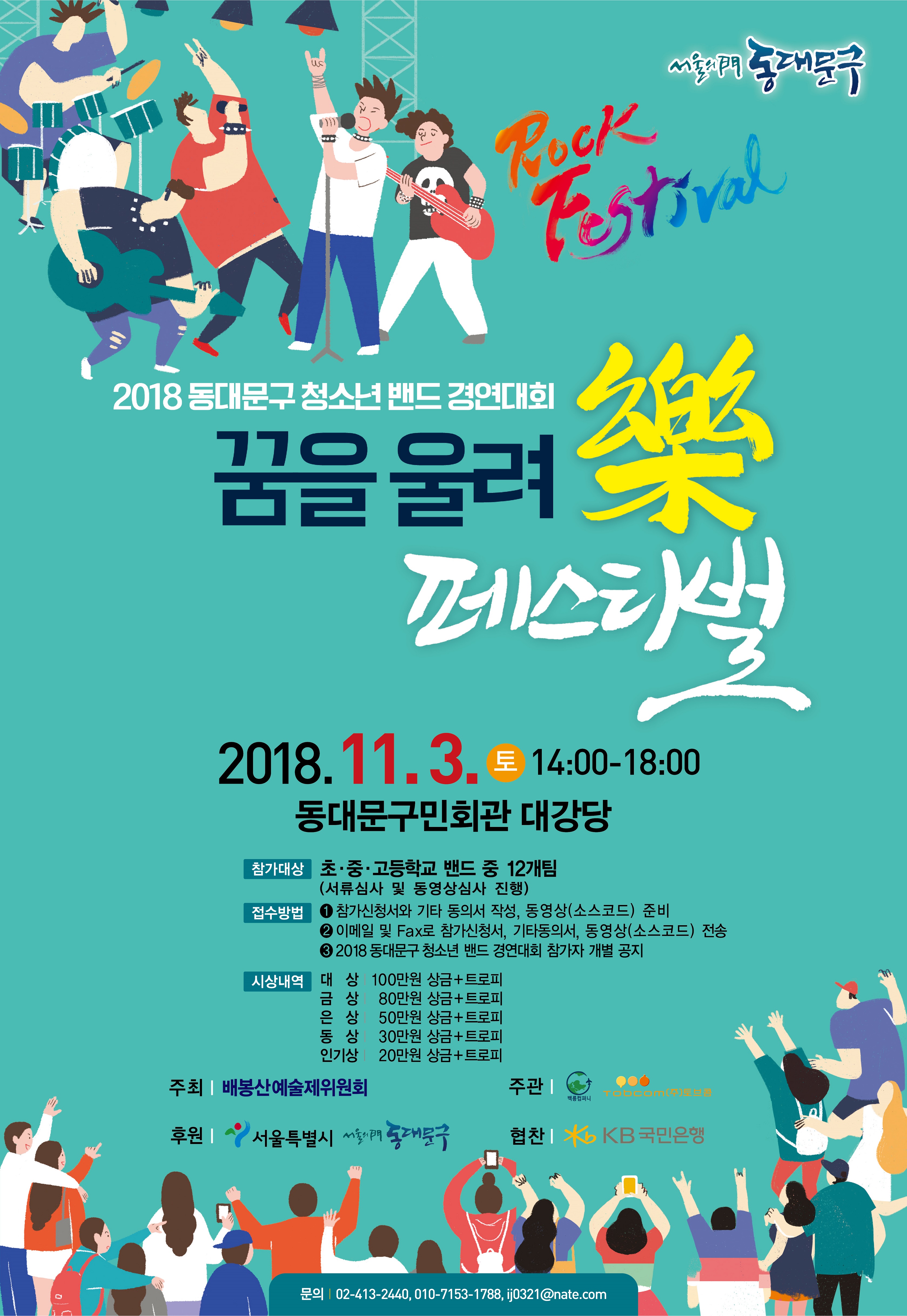 2018년 11월 3일(토) 오후 2시부터 6시까지 서울 동대문구에 위치한 동대문구민회관 대강당에서 ‘꿈을 울려樂(청소년이여, 꿈을 울려라)’ 란 슬로건으로 ‘2018 동대문구 청소년 밴드 경연대회’가 열린다. 서울특별시와 동대문구청의 후원으로 이뤄지는 이번 대회는 배봉산예술제위원회가 주최하고 백룡컴퍼니,(주)토브콤의 주관사로 열린다.