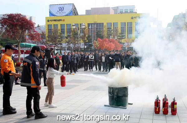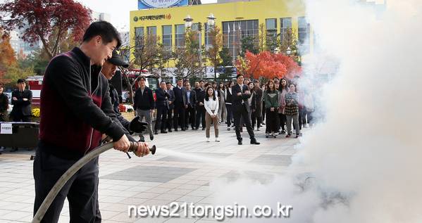 ▲ [하반기 소방훈련2]중점 훈련사항으로는 자위소방대에 의한 화재 통보 및 전파, 청 내 직원들의 신속한 대피를 위한 유도원 배치훈련, 소화기·소화전을 이용한 화재의 초기진화 훈련 등이었으며 훈련 종료 후에는 자위소방대별 임무수행능력 및 미비점 보완에 대한 강평을 했다.