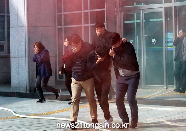 ▲ [하반기 소방훈련1]이번 훈련은 구청사 1층에서 원인 미상의 화재가 발생해 건물전체에 화재가 확산되는 상황을 가정하고 오후 2시부터 본청 자위 소방대원과 둔산119안전센터 합동으로 훈련이 진행됐다.