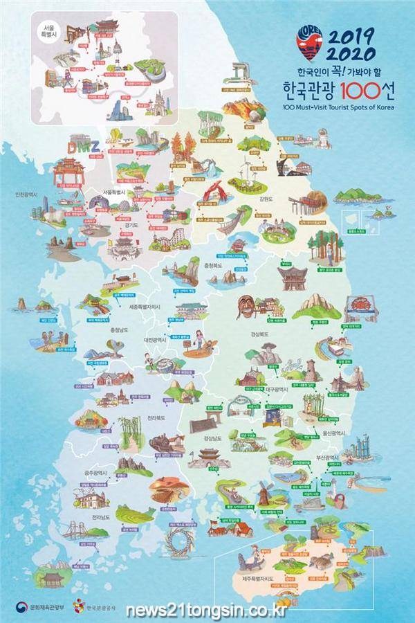 ▲ 2019-2020 한국관광 100선 지도 / 문화체육관광부 제공【세종=뉴스21통신】이기운 기자 = 문화체육관광부(장관 도종환, 이하 문체부)는 한국관광공사(사장 안영배)와 함께 우리나라 대표 관광명소 ‘한국관광 100선’을 선정해 발표했다. ‘한국관광 100선’은 한국인이 꼭 가봐야 할 우수 관광지 100개소를 2년에 한 번씩 선정해 국내외에 홍보하는 사업으로, 이번 선정으로 4회를 맞이했다.