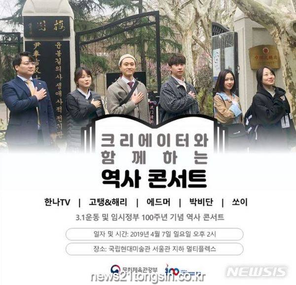 ▲ 크리에이터와 함께하는 역사 콘서트 포스터[세종=뉴스21통신]이기운 기자 = 문화체육관광부(장관 박양우, 이하 문체부)는 3.1운동 및 대한민국임시정부 수립 100주년 기념사업추진위원회(공동위원장 이낙연 국무총리, 한완상 전 통일・교육부총리, 이하 위원회)와 함께 3.1운동 및 대한민국 임시정부 수립 100주년을 맞이해 4월 7일(일) 오후 2시부터 100분간, 국립현대미술관 서울관 멀티플렉스에서 ‘크리에이터와 함께하는 역사 콘서트’를 진행한다.