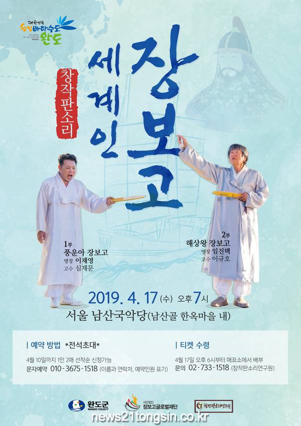 창작판소리연구원은 4월 17일(수) 오후 7시 서울 남산국악당(남산골 한옥마을 내)을 시작으로 임진택 명창 등이 출연하는 창작판소리 ‘세계인 장보고’ 공연을 진행한다고 5일 밝혔다.
