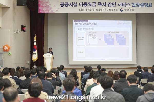성동구(구청장 정원오)가 지난 4월 16일 구청 3층 대강당에서 행정안전부 주관 ‘행정정보 공동이용 활성화를 위한 공공시설 이용요금 즉시 감면서비스 현장설명회’를 개최했다고 밝혔다.