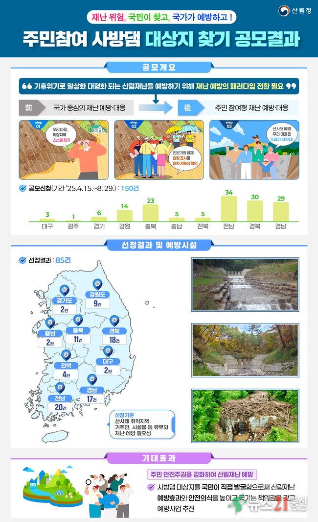 산사태 위험지 국민이 찾고... 국가가 함께 예방한다!- 주민 참여 사방댐 대상지 공모 결과, 85개소 선정-산림청(청장 김인호)은 기후재난으로 인한 산사태 인명피해 최소화를 위해 주민이 직접 사방댐 등 사방사업 대상지를 찾았다고 23일 밝혔다. 산림청은 지난 4월부터 8월까지 ‘주민 참여 사방댐 대상지 공모’를 추진해 산사태 취약...