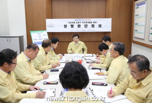 5월 27일 구청사 지하1층 통합방위상황실에서는 이동진 도봉구청장을 비롯한 부구청장, 행정관리국장, 기획재정국장, 복지환경국장, 도시관리국장, 안전건설관리교통국장 등이 참석한 가운데 신속하고 효율적으로 재난에 대응하기 위한 상황판단회의를 개최했다.