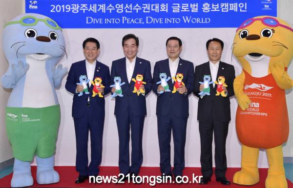 ▲ 좌측으로 부터 김영록 전남지사, 이낙연 총리, 이용섭 광주광역시장, 조영택 사무총장 / 광주광역시 사진제공광주광역시(시장 이용섭)는 4일 오후 수영대회 경기장인 염주종합체육관 내 빛고을체육관에서 이낙연 국무총리와 이용섭 광주시장, 김영록 전남도지사, 조영택 수영대회조직위 사무총장과 대회 관계자 등 30여 명이 참석한 가운데 ‘2019광주세계수영대회 글로벌 홍보 캠페인’ 행사를 개최했다.