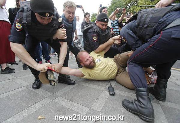 ▲  출처=로이터통신최근 러시아의 한 기자가 대부업체의 비리에 대해 취재하던 도중 마약 거래 혐의로 경찰에 체포되자, 러시아 독립기념일인 어제 모스크바에서 1천 2백여 명이 항의 시위에 나선거다.