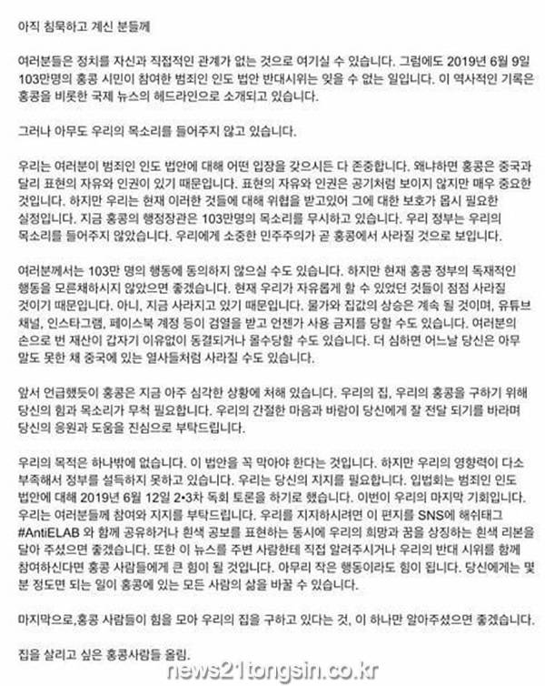 ▲  사진출처=트위터'범죄인 인도 법안'에 반대하는 홍콩 시민들 시위가 격렬해지고 있다. 이런 가운데 13일 국내 SNS와 주요 커뮤니티에는 한국어로 쓴  '홍콩 사람들이 쓴 편지'가 퍼지고 있다.