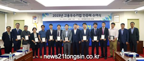 ▲ 제공=제주도청제주특별자치도는 24일 오전 도청 삼다홀에서 ‘2019년도 고용우수기업’으로 선정된 11개사를 대상으로 고용우수기업 인증패를 수여했다고 밝혔다.