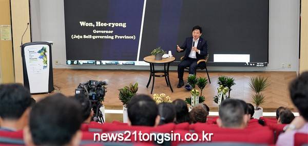 원 지사는 “제주에는 경제성장을 위한 개발 및 투자와 제주다움을 지키자는 환경보전의 두 가지 가치가 충돌하며 갈등을 빚고 있다”면서 제주 제2공항, 폐기물 처리장, 하수처리시설 등을 언급했다.