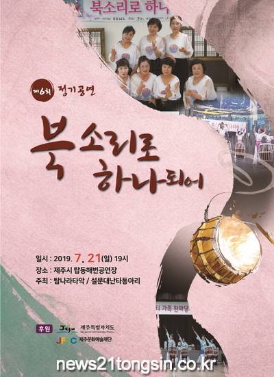 제주특별자치도 설문대여성문화센터(소장 김정완) 소속 난타동아리 ‘탐나라타악’(회장 김순자)는 2019. 7. 21(일) 저녁 7시부터 탑동 해변공연장에서 「북소리 하나되어」라는 주제로 제6회 정기공연을 개최한다고 밝혔다.
