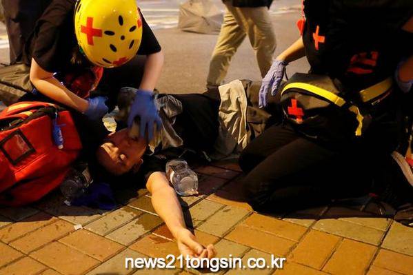 ▲  출처=로이터통신21일 (일요일) 홍콩에서 범죄인 인도법에 반대하는 대규모 시위가 열린 가운데 일부 시위대가 중국 정부를 상징하는 휘장에 페인트를 뿌리는 등 반중감정을 표출하면서 경찰과 충돌했다.