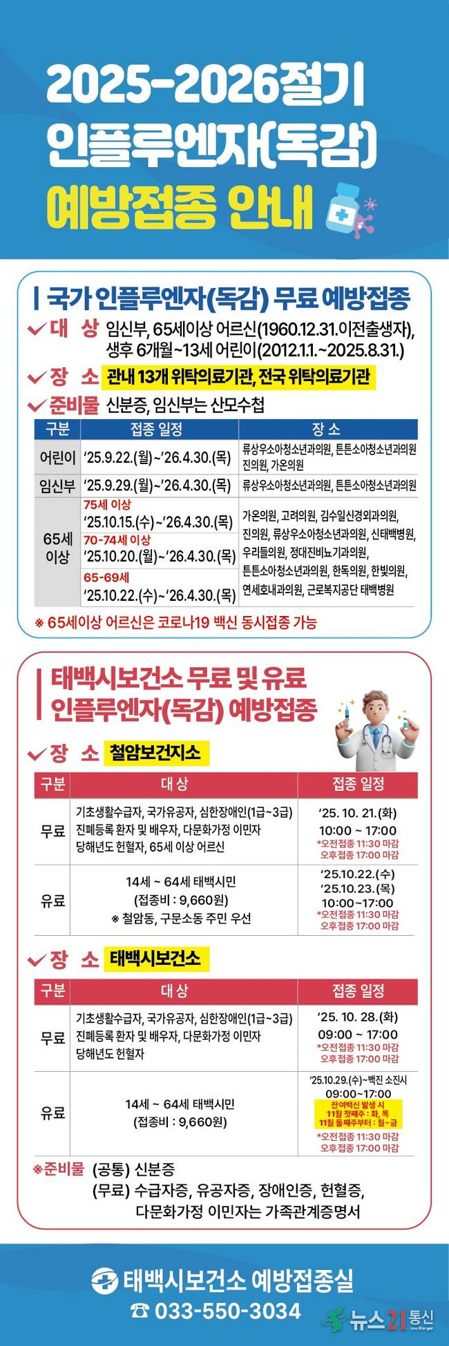 태백시(시장 이상호)는 시민들의 건강하고 안전한 겨울나기를 위해 2025년 인플루엔자(독감) 예방접종을 당초 11월 초에서 3주 앞당겨 10월 21일부터 실시한다고 밝혔다.이번 조치는 예년보다 독감 유행이 빨라질 것으로 예상됨에 따라 시민 건강 보호를 최우선으로 한 결정으로, 예방접종은 위탁 병·의원, 태백시보건소, 철암보건지소에..