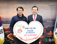 [뉴스21 통신=최병호 ]*사진출처-울산북구청연암철물공구종합상사 박영수 대표는 14일 북구청장실에서 효문동 저소득 세대 지원을 위한 이웃돕기 성금 1천만원을 박천동 북구청장에게 전달했다.