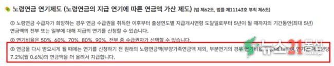 현재, 노령연금은 수령하는 나이를 1년 뒤로 연기할때마다 연간 7.2%를 증액한다. 월로는 0.6%씩 늘려준다.